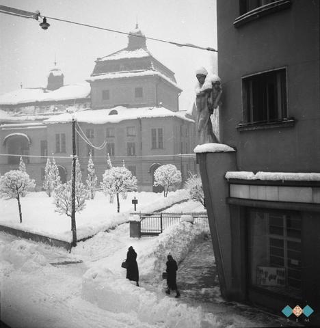 Pogled na Slovensko narodno gledališče Drama in vogal stavbe Mali nebotičnik na Igriški ulici 3.