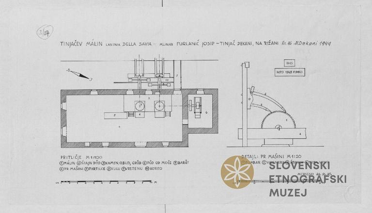 Tinjačev malin - tloris pritličja s strojno opremo, detajl "Pr mašini", merjeno 24.9.1949. Lastnik Della Savia, mlinar Furlanič Josip - Tinjač, Dekani 46.