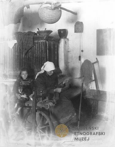 Del sobe ("hiše"). V ozadju peč, ženska prede na kolovrat.