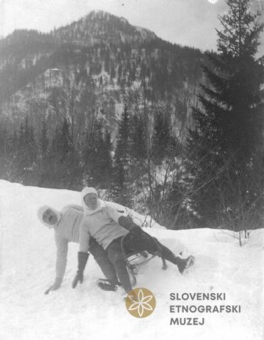 Sani, okolica Bohinja. Na fotografiji Alfonz in Karel Mencinger na tekmi v Bohinju. Fotografirano v mesecu februarju 1913.