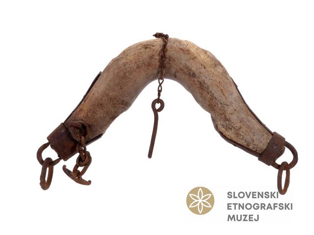 118. š = 52 cm / g = 7,8 cm / v ovrat. = 6,5 cm / š med odprt. kambe = 14 cm // pr. odprt. za kambo = 3,5 cm T = 3,12 kg Glede vsega tudi za ta primerek iz zbirke "Sirnikove punce" velja komentar k kat. št. 113, EM 22560. Poleg tega, da je na hrbtni strani počen, ima tudi odkrhnjeno eno odprtino za kambo. Je slabše ohranjen kakor oblikovno zelo soroden prejšnji enojni jarem; najverjetneje, ker je narejen iz bukovine. LES: bukovina