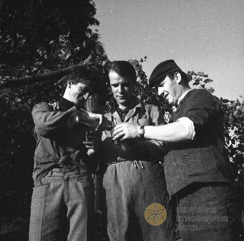 Fantje - obiralci iz Žerovincev pijejo likof po končani trgatvi.