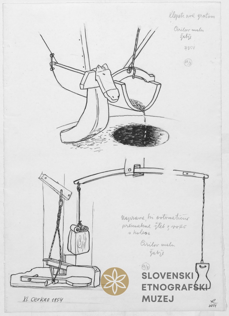 Naprava, ki avtomatično premakne žleb z vodo s kolesa. Cirilov "maln" (mlin), Žabže...