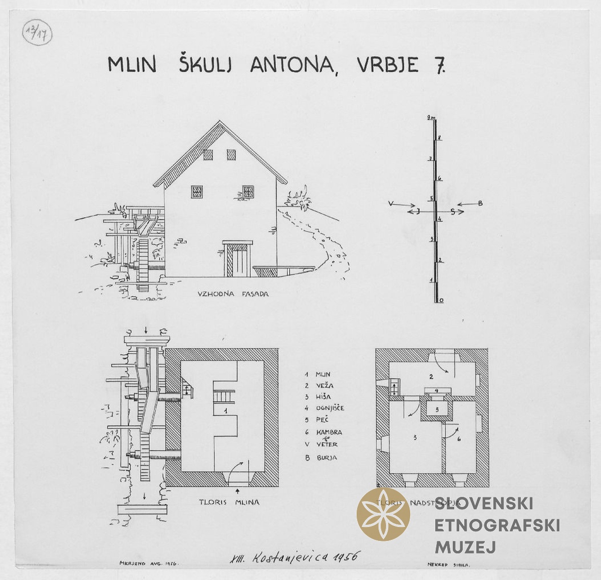 Škuljev mlin, Vrbje 10 (ob vodi Sušici) in tloris. Teren 13- Kostanjevica (1.-31.8.1956).