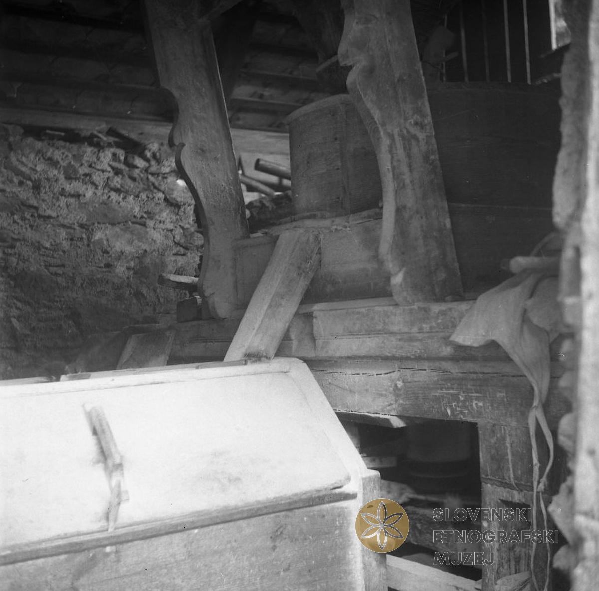 Notranjščina Lazarjevega "malna" (mlina). Lastnik Jernej Tušek - u Lazu, Dolenji Novaki...