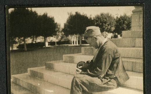 Hilda Kozak na terasi. Joža Kozak je seriji fotografij dodal opis Prijazen dom v Kranju. V: album...