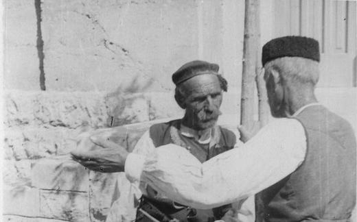 Hilda Kozak in njena mama sedita za mizo pred hišo. Joža Kozak je seriji fotografij dodal opis...