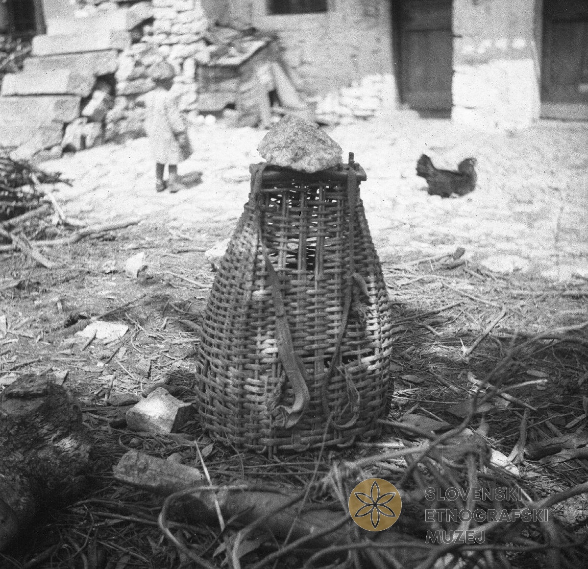 Kletka za kokoš in piščance (zbrenčja za kjočo in cipce). Spletel Janez Mišigoj. Hruševlje 12, pri...