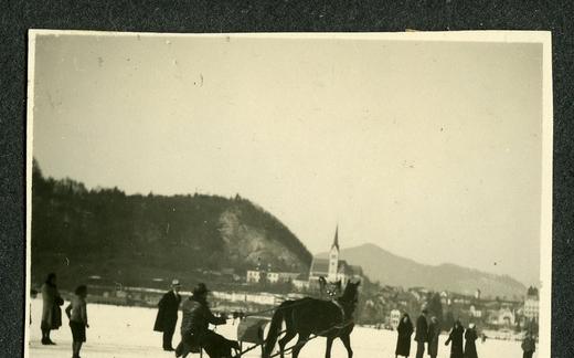 Motorist za sabo vleče smučarja po zamrznjenem in zasneženem Blejskem jezeru. V: album IV, 1931-...