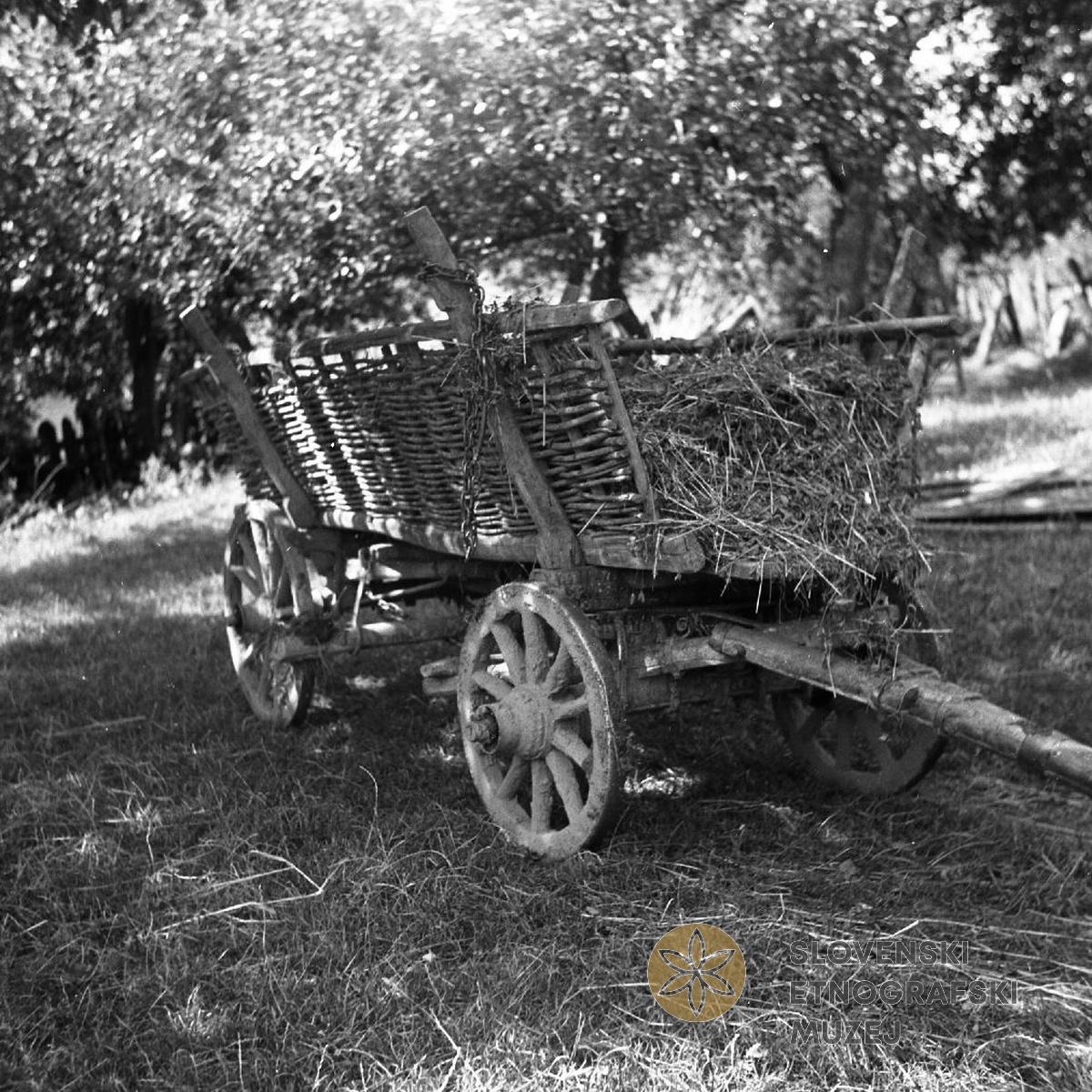 Pletena "šajtrga" (ročni voz), v kateri vozijo travo, Katarina Starešinič, Drašiči 18...