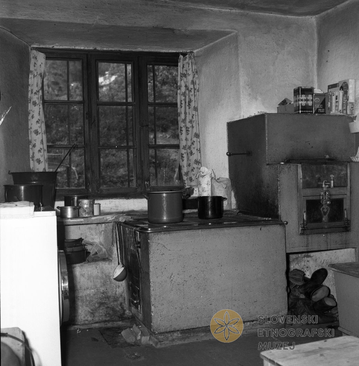 Star zidan štedilnik v kuhinji, ki je bila prvotno klet (levo pralni stroj), pri Franc Žmitek,...