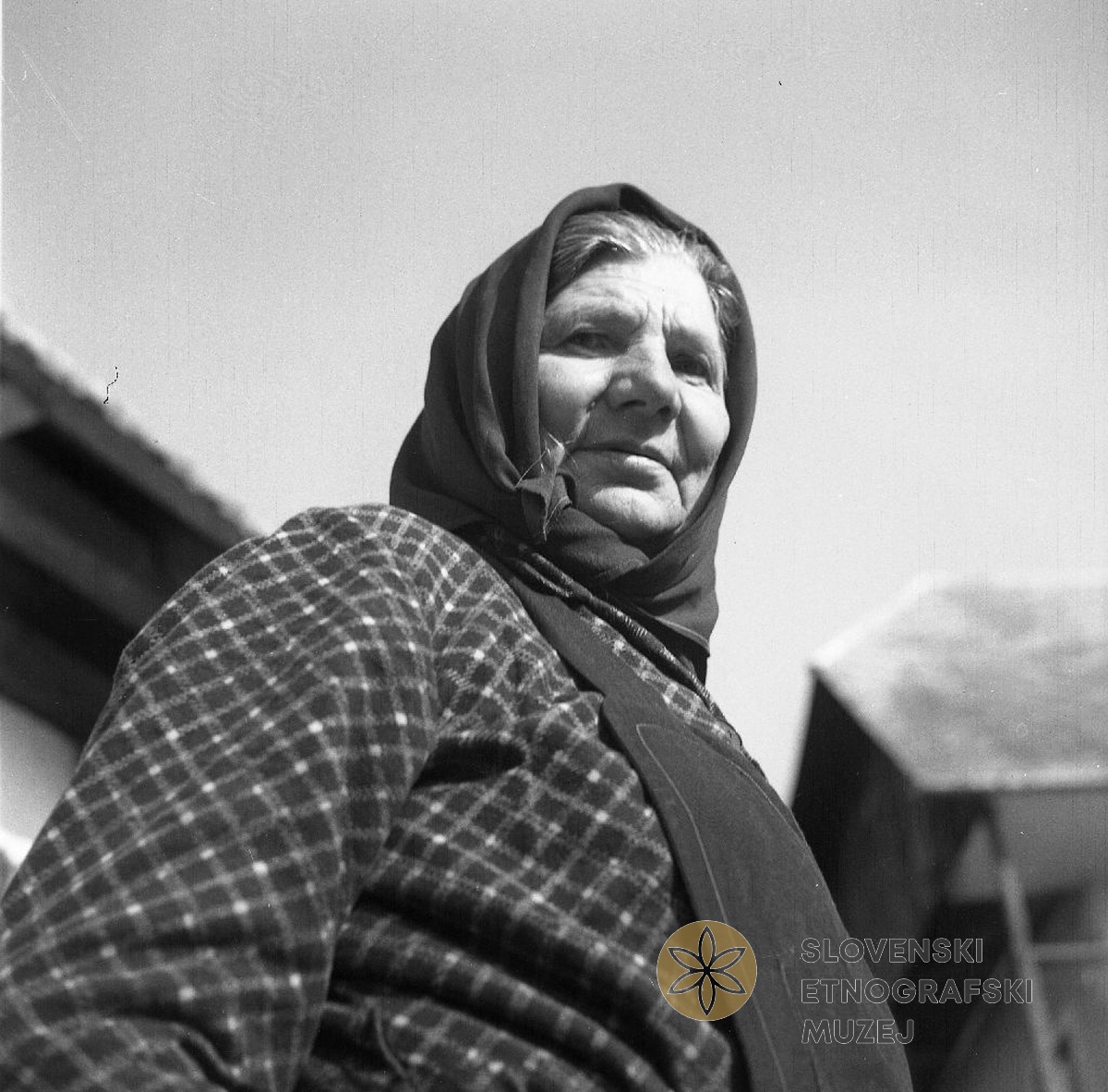 Nedeljska delovna noša, Ana Simonič, Drašiči 57. Teren 22 - Drašiči, Bela Krajina. Posneto v času...