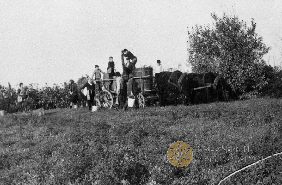 "Pütarji" (trgači) stresajo grozdje v kadi na vozu v Špecovem vinogradu. Teren 29 -...