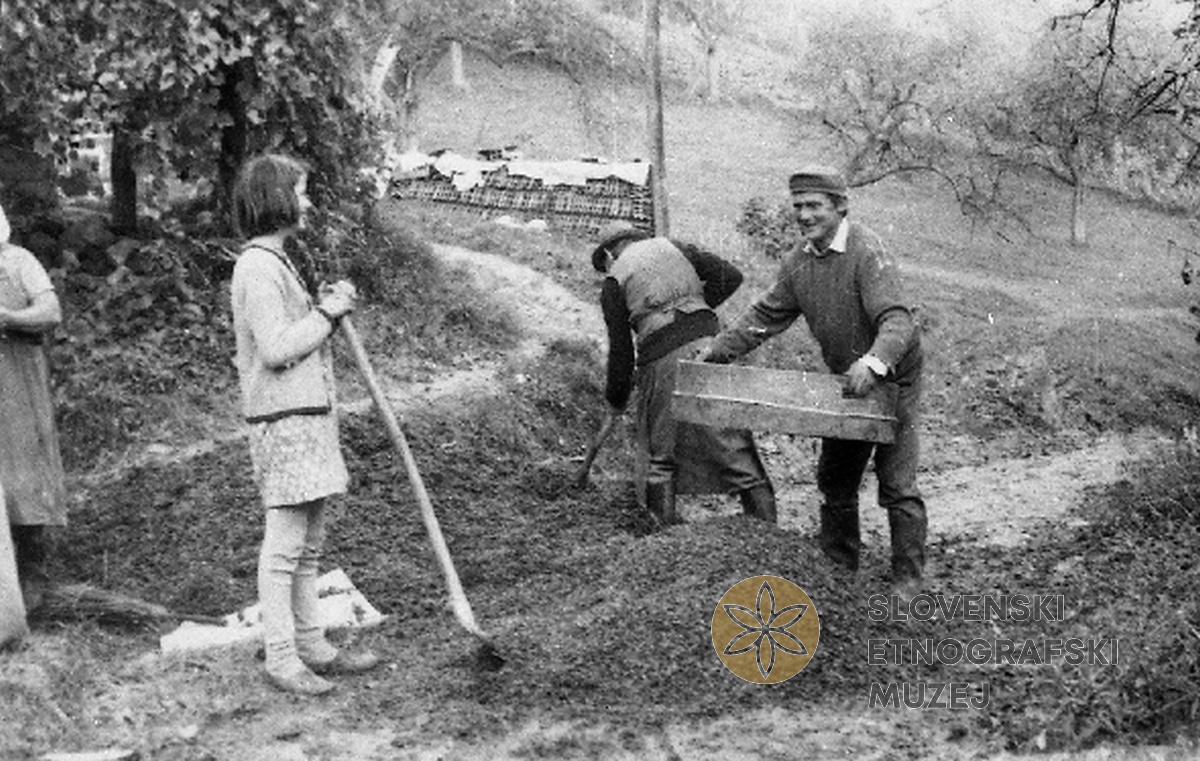 "Putarji" (trgači) v ozadju v Špecovem vinogradu. Teren 29 - Jeruzalemske Gorice, 1972...