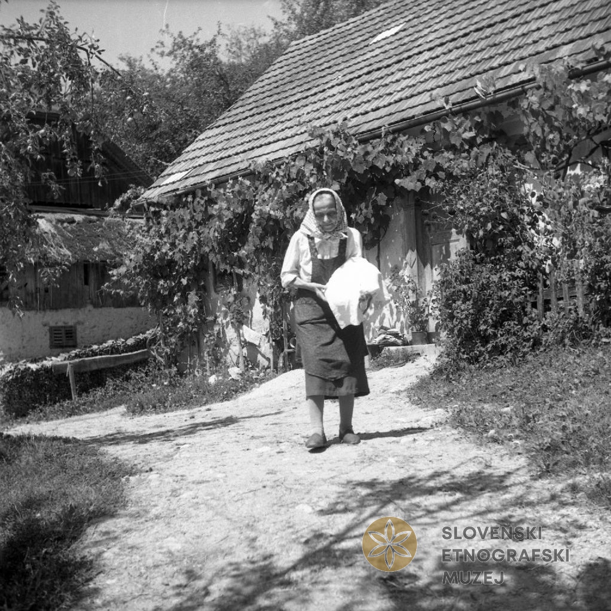 Marija Simončič nese štruco žanjicam na Veliko mašo. Kamnje 23. Teren 18 - Šentrupert na Dolenjskem...