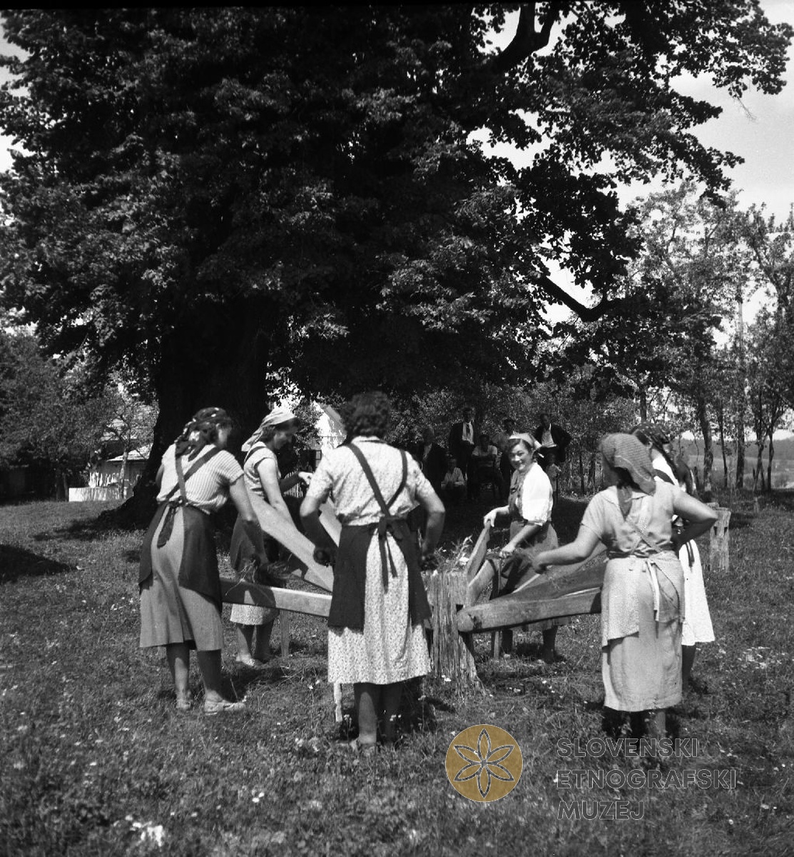 Anzlin Marija, rojena 1900, Mačkovec 12, pri Frlugovih, s "prvito" (zavezano) ruto. Teren...