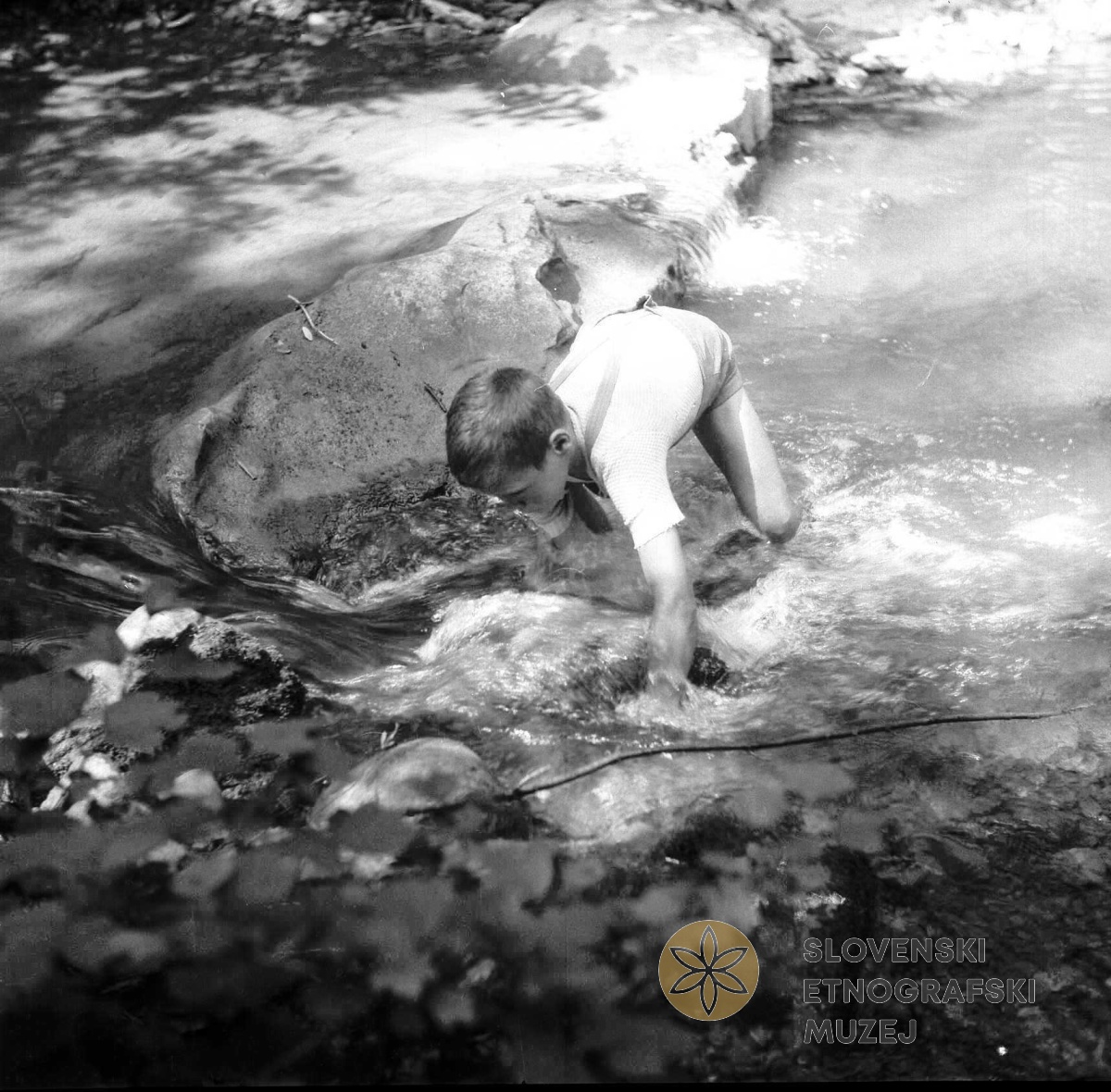 Podbreg 34 1.8.1958 F0000015/226 Ribe lovi z roko, U mlin, Podbreg 34, Jelačič Marija. Teren 15 - Vipava, 1. - 28.8.1958. Ribolov
