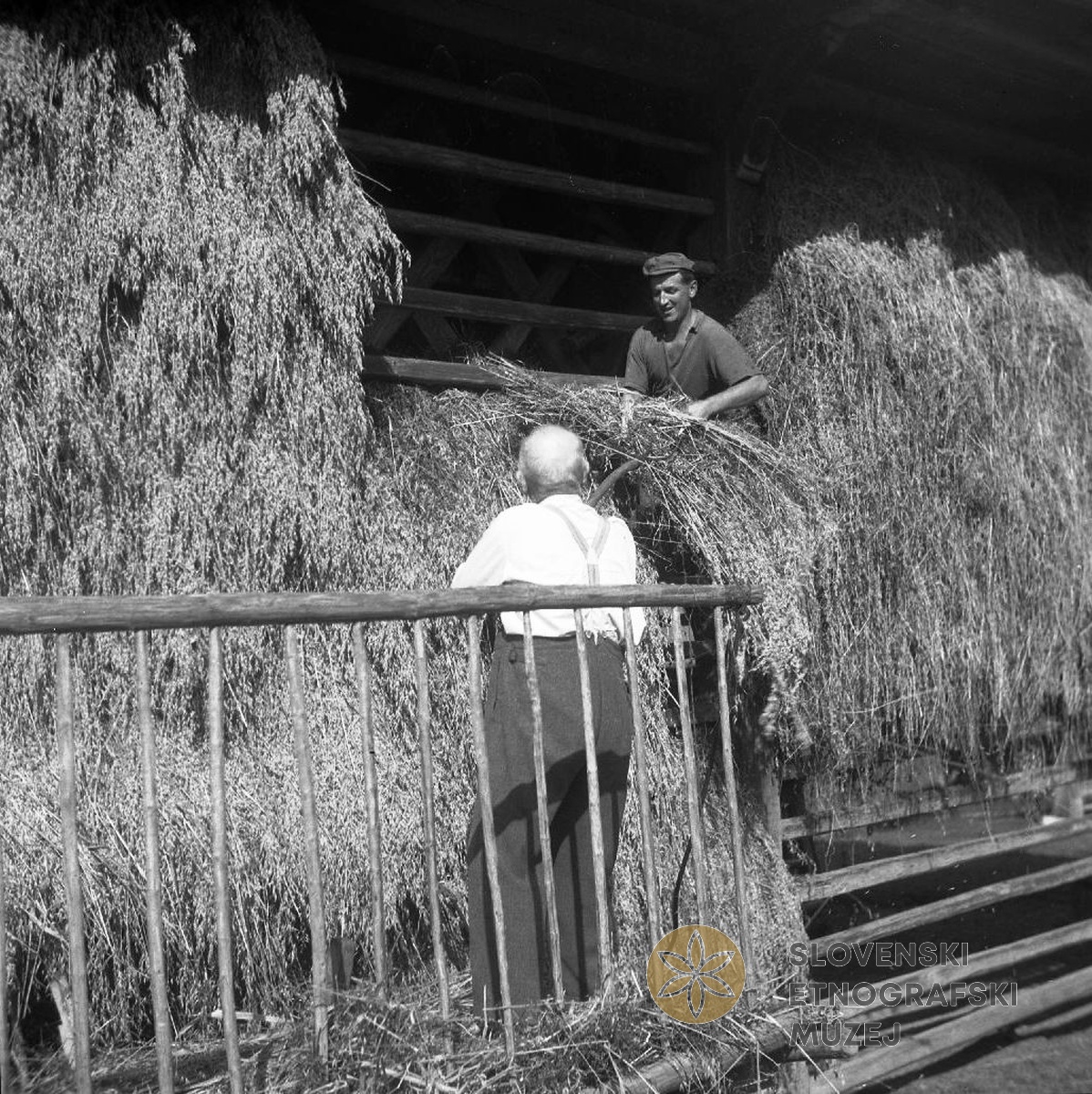 Podajanje in zdevanje snopov ovsa v "kazuc" (kozolec). Lastnik Janez Cimperman, Rob 3...