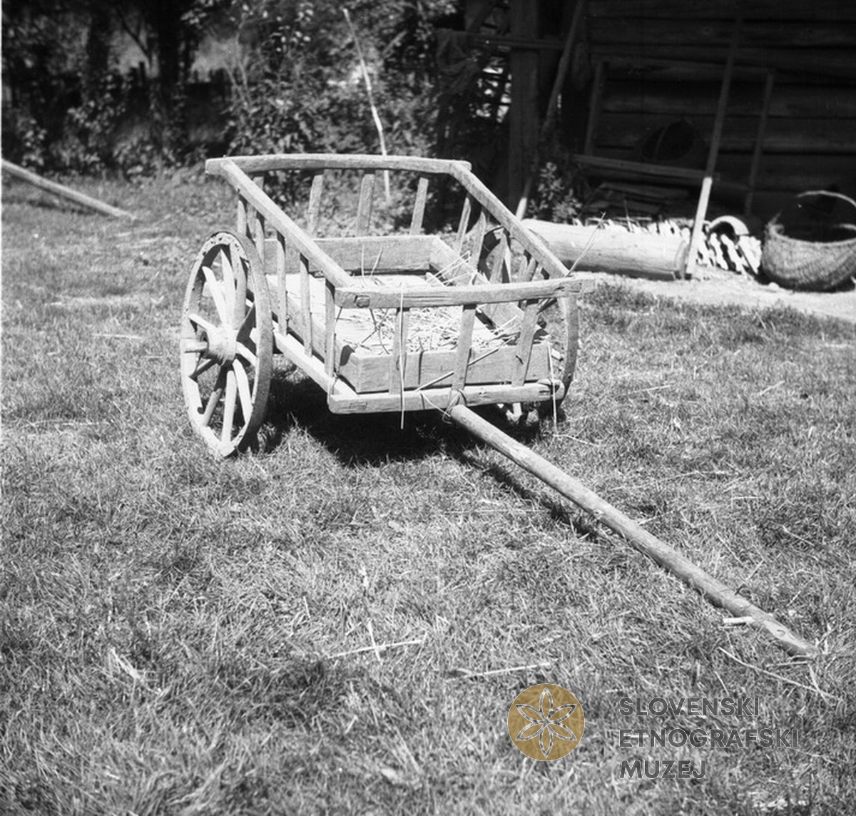 "Kounica"- voz za gnoj; na njem čebri z vodo, spredaj trage, Sela 18, pri Anzeljnu. Teren...