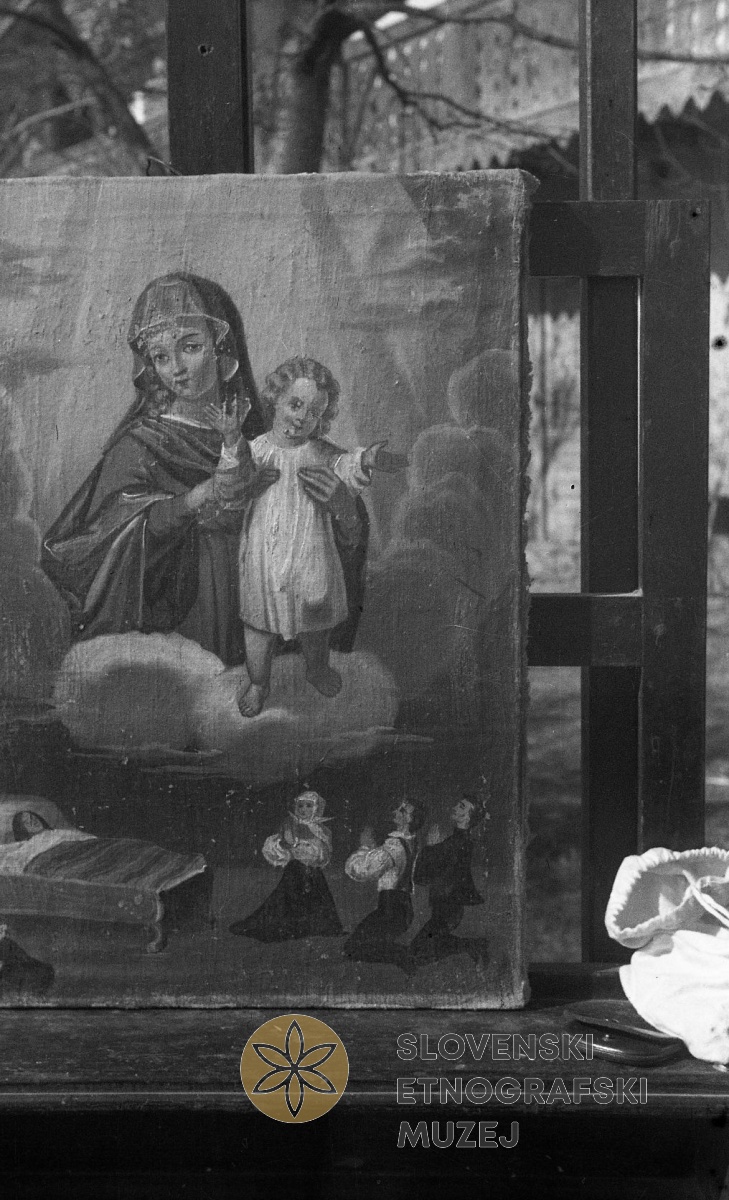 Slika na platno (olje) ex voto, v zbirki g. Lea Kozlevčarja, Slovenska vas 19. Marija Pomočnica,...