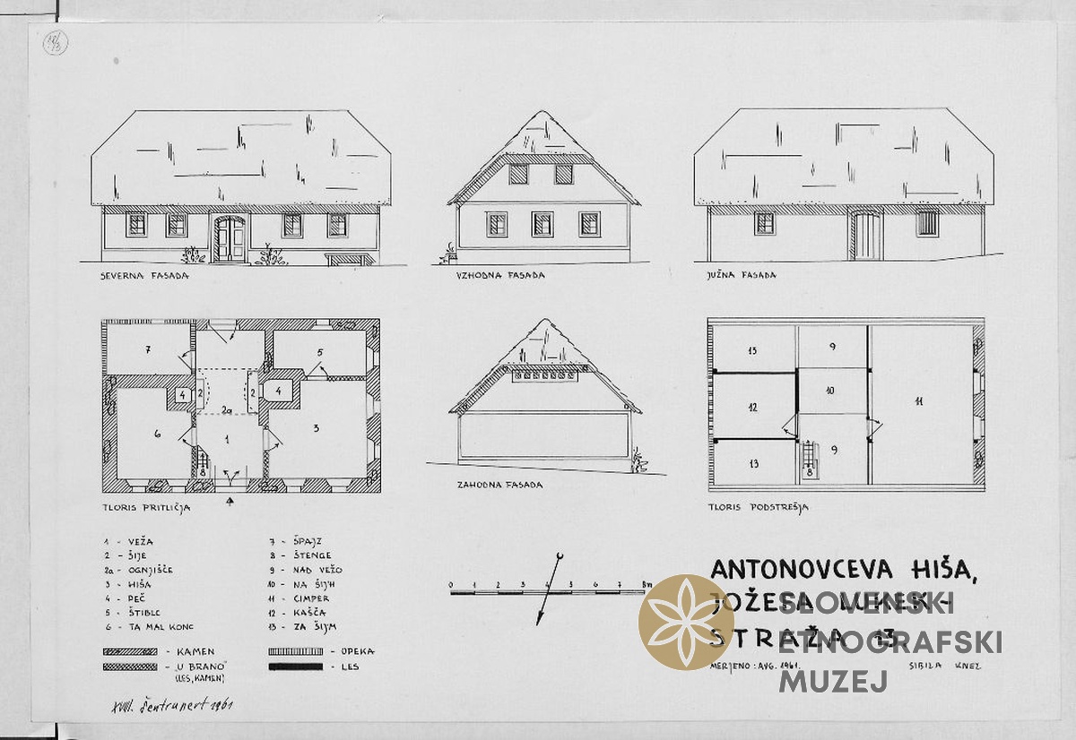 Antonovceva hiša: 4 fasade, 2 tlorisa. Lastnica Ivana Lukek, Straža 9.