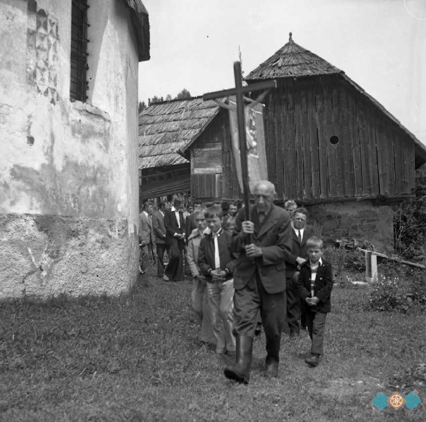 Ljudski pesnik Blaž Mavrah nese križ za procesijo, Strojna. Teren I - Koroška, Štajerska, Prekmurje.