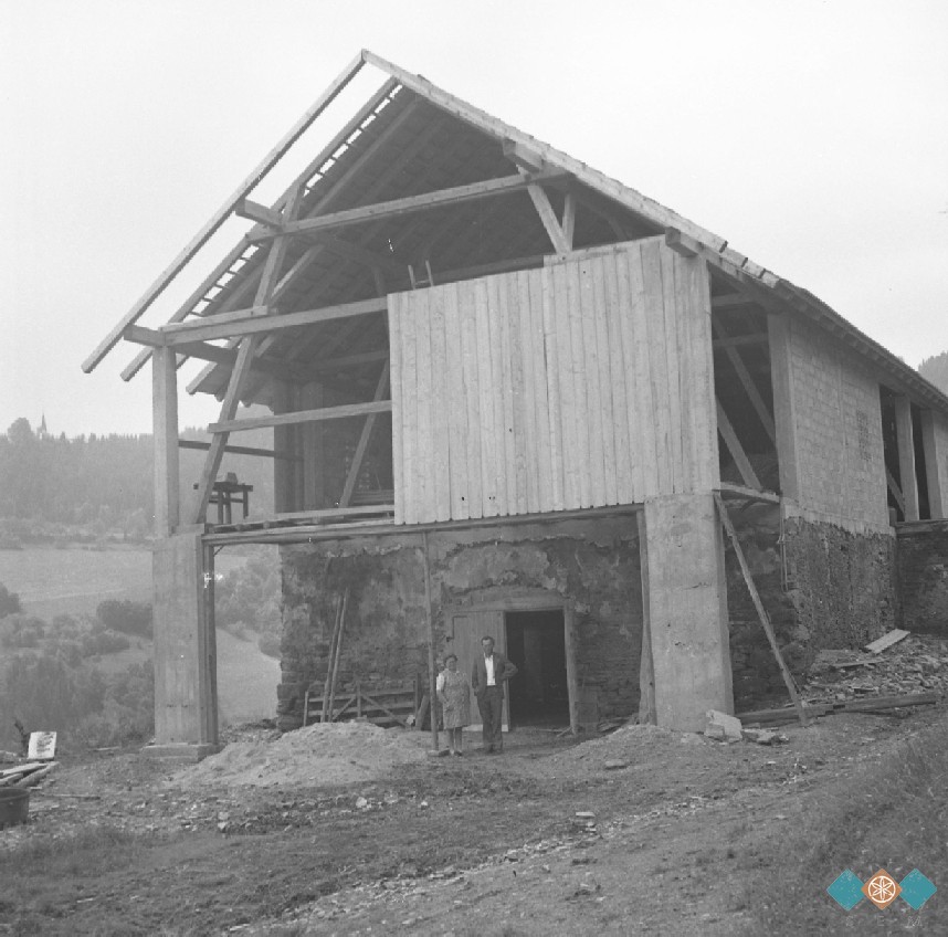 Na mestu pogorele štale (hleva) raste s pomočjo sosedov nov hlev, pri Utku, Strojna. Teren I -...