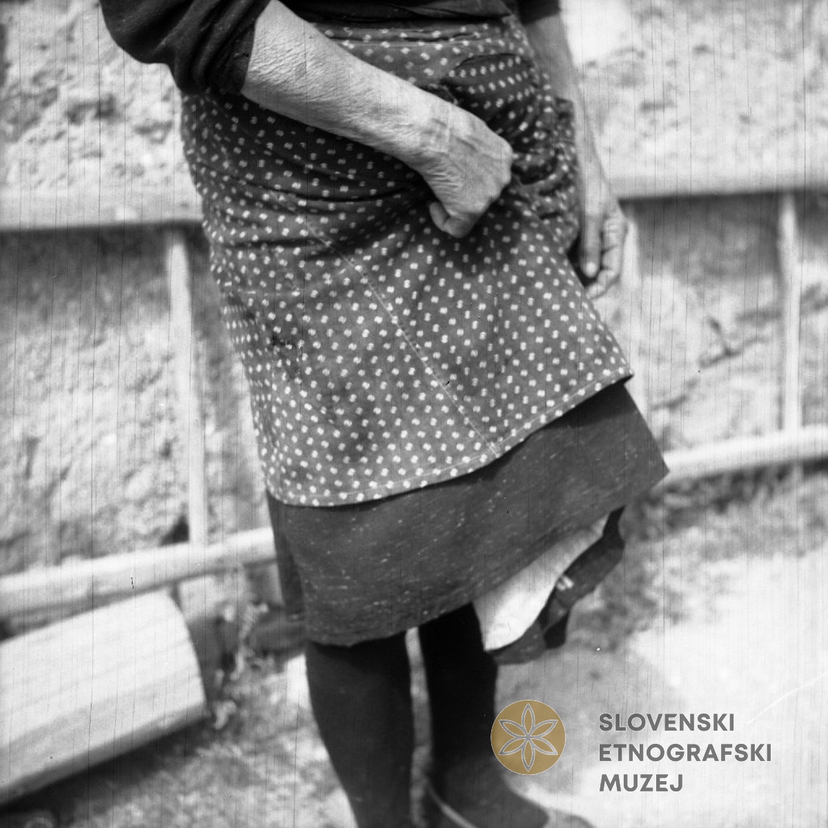 Oblečena za žetev v belem predpasniku, Viševek 28. Teren 19 - Loška dolina (1.-15.8.1962).