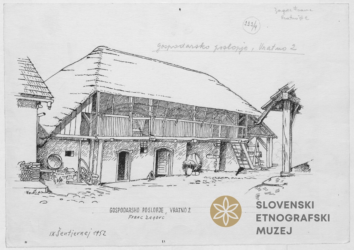 Gospodarsko poslopje: hlev, pod, miza, itd. ("ta vsok stari"). Lastnik Franc Zagorc,...