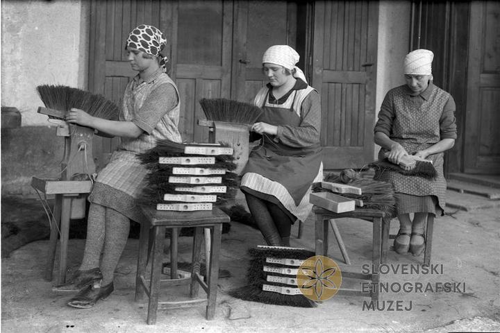 Zaposlene v Nagličevi delavnici šivajo metle na dvorišču obrtne delavnice, 30. leta 20. stoletja.