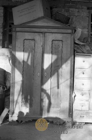 Stara zavržena omara in korito (za mesenje kruha) pred gospodarskimi prostori, Marin Janez, Boreci 40. Ta omara z letnico 1887.