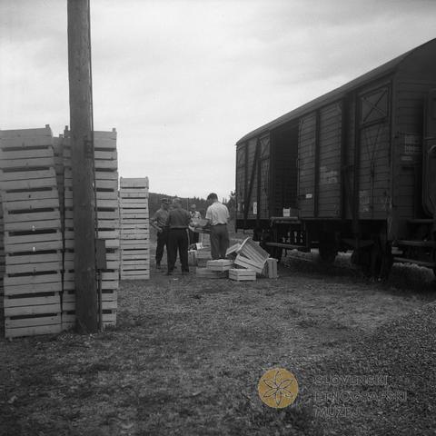 Gajbe nakladajo v vagone na železniški postaji v Velikih Laščah.