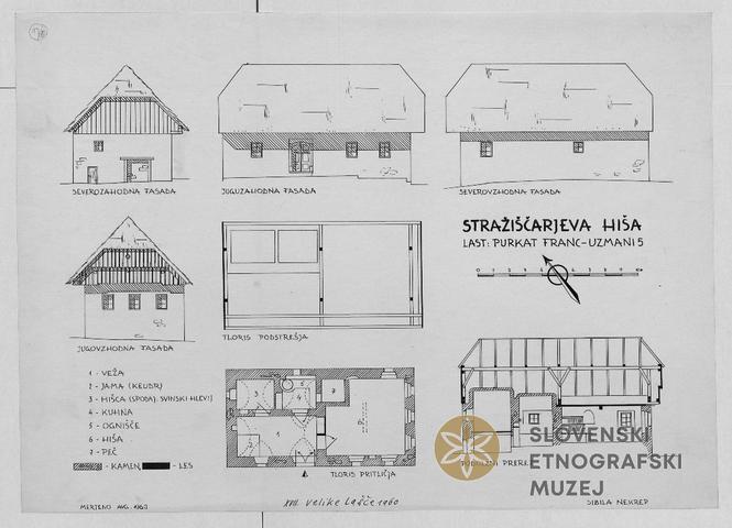 Stražiščarjeva hiša: 4 fasade, 2 tlorisa, 1 prerez. Lastnik Franc Purkat, Uzmani 5.