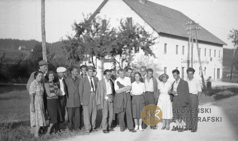 Gostje (dr. Grafenauer, dr. Mikuž, univ. prof. Zupanić, tov. Zadnikar) in ekipa EM ob otvoritvi razstave v Šmarju.