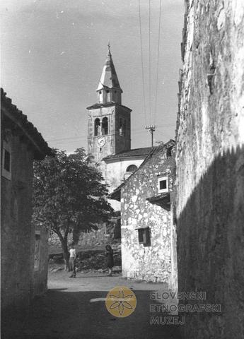 Ulica in cerkev v vasi Lipa na Krasu. Zbirka: Foto oddelek Tiskovnega urada pri predsedstvu vlade Slovenije. Pridobljeno: 28.6.1946