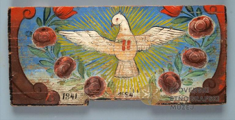 Golob kot podoba sv. Duha, enega izmed oseb konstrukta sv. Trojice, ki je nastal zaradi težnje zgodnjega krščanstva, da se kljub drugačnemu nauku opredeli kot monoteistično, je naslonjen na svetopisemsko primero iz novega testamenta: “Videl sem Duha, ki je prihajal kakor golob z neba in ostal na njem” (Janezov evangelij 1: 32). Med preprostim prebivalstvom se je razširila predstava goloba kot sv. Duha zlasti s slikami na steklo, na katerih je upodobljena ikonografska predstava “prestol milosti” z Bogom očetom, Kristusom na križu in sv. Duhom v podobi goloba. Muzeju je končnico prodal A. Černevšek iz Nove Štifte pri Gornjem Gradu.