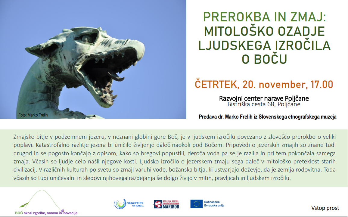 Vabljeni na predavanje Prerokba in Zmaj: Mitološko ozadje ljudskega izročila o Boču v četrtek, 20. novembra 2025, ob 17.00, v Razvojni center narave Poljčane (Bistriška cesta 68, Poljčane). Predaval bo dr. Marko Frelih, kustos iz Slovenskega etnografskega muzeja.