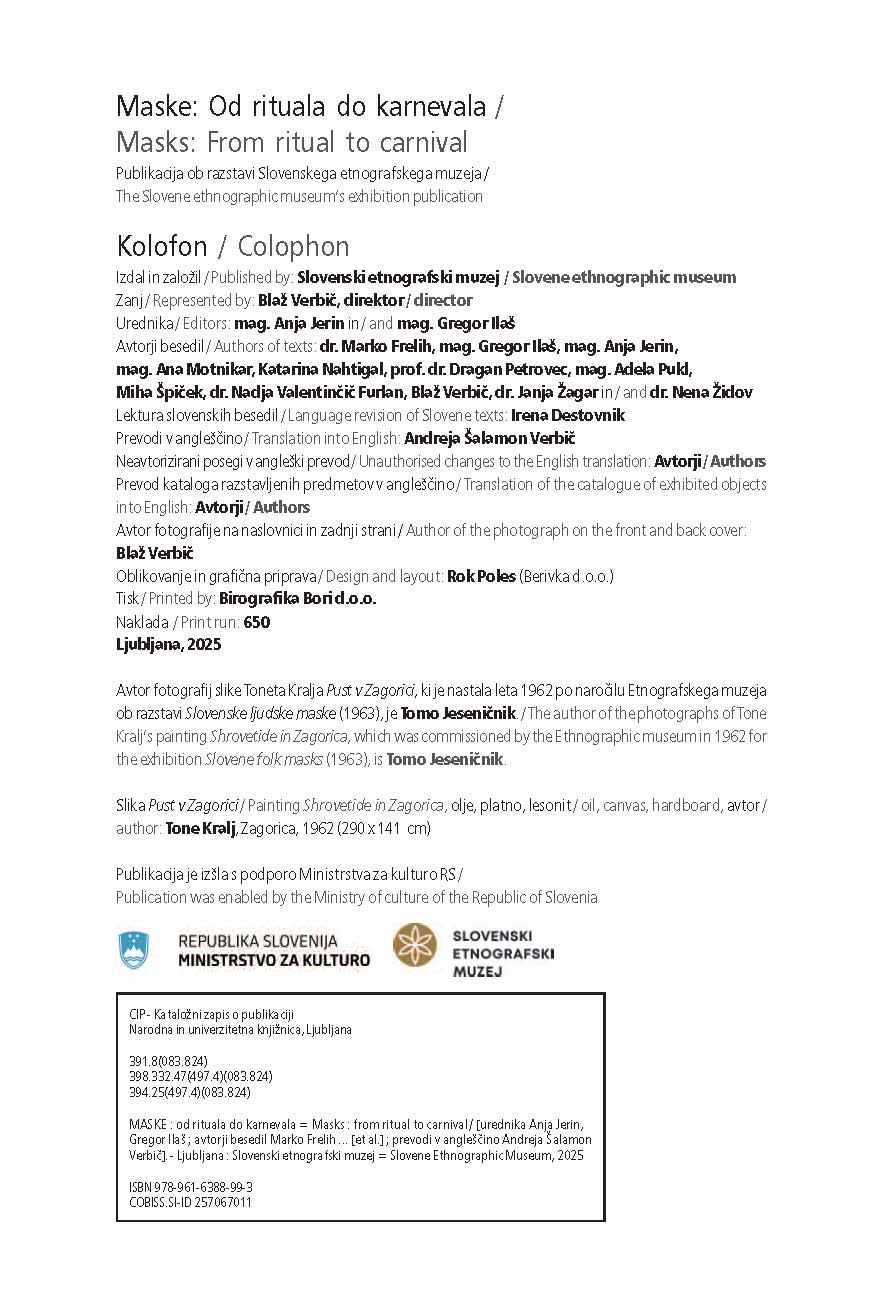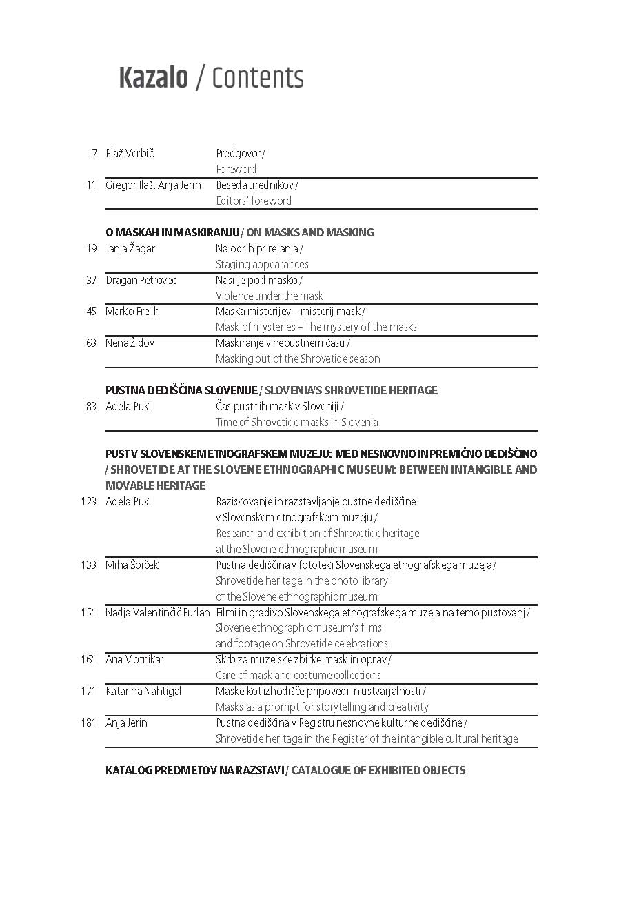 Publikacija ob razstavi Maske: Od rituala do karnevala prinaša na različnih ravneh napisana besedila – nekatera ponujajo teoretske nastavke proučevanja kostumiranja in maskiranja, medtem ko druga opisujejo sodobno, na terenu temelječe stanje. Publikacija, razdeljena na štiri poglavja, je plod terenskega dela, ki poteka v sodelovanju s pustnimi skupinami, a zaradi številčnosti pustnih šeg na terenu predstavlja izbrane primere. Kot je navedeno v podnaslovu, je publikacija poskus razumevanja pojava maskiranja, ki ga razumemo kot postopen prehod od maskiranja kot ritualne prakse k sodobnim oblikam, ki postajajo vedno bolj karnevalske.