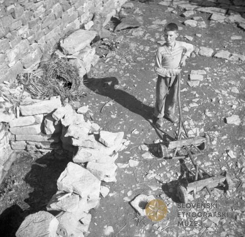 Otroški voziček, v obzidanem prostoru je gnojnik, Tinjan.