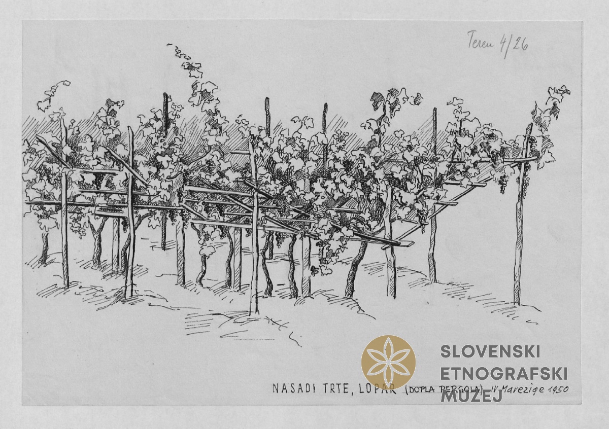 Pod latnikom so "kouci", pripravljeni za k trtam v vinogradu, Goče 19, Vovk Anton. Teren...