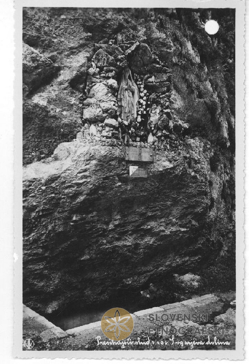 Logarska dolina. Na razglednici presihajoči studenec. Med leti 1928 in 1947.