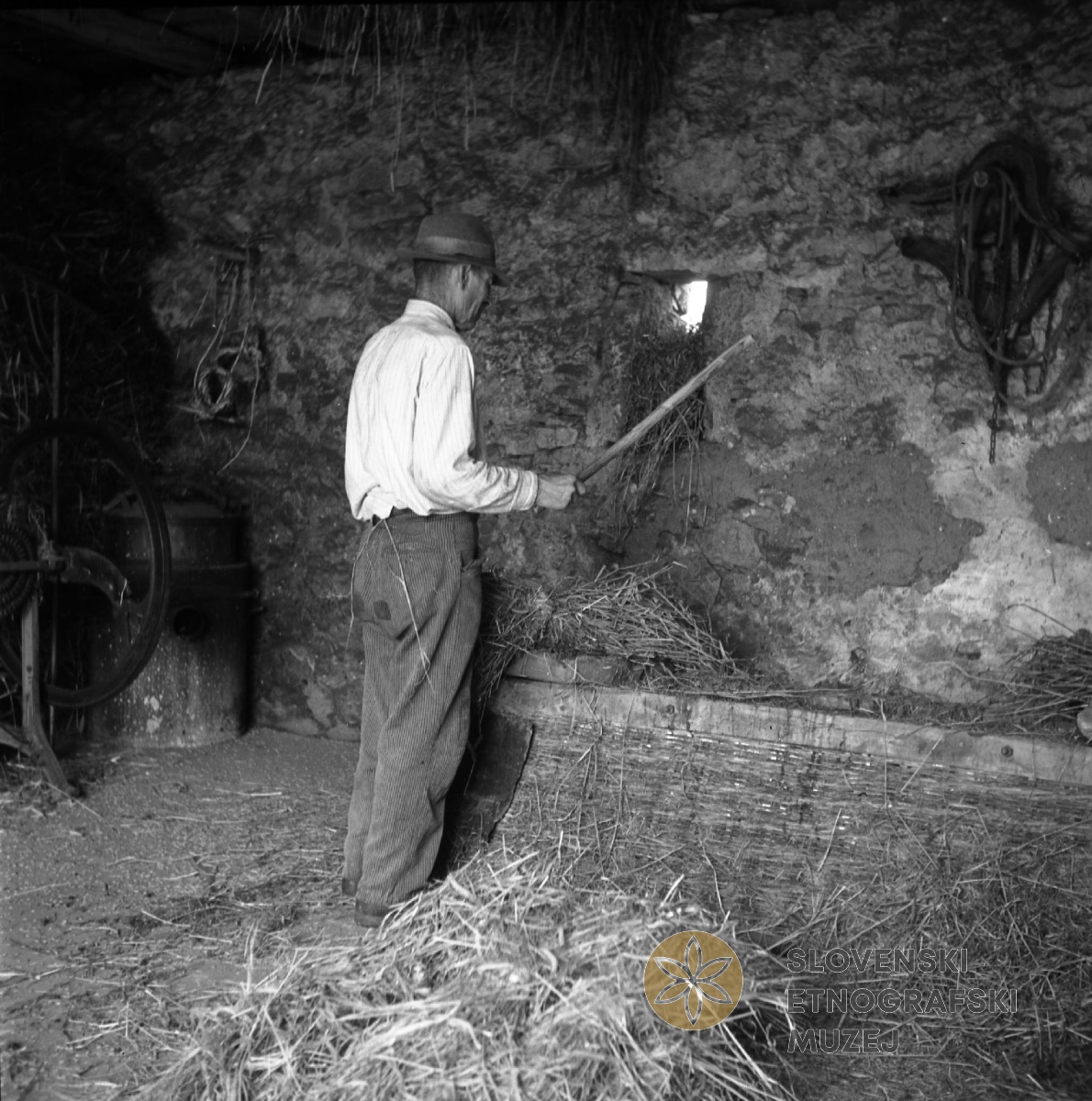 Stari Polez (82 let) mlati žito na skednju na obrnjenem gnojnem košu, Ritomeče 9. Teren 12- Brkini...