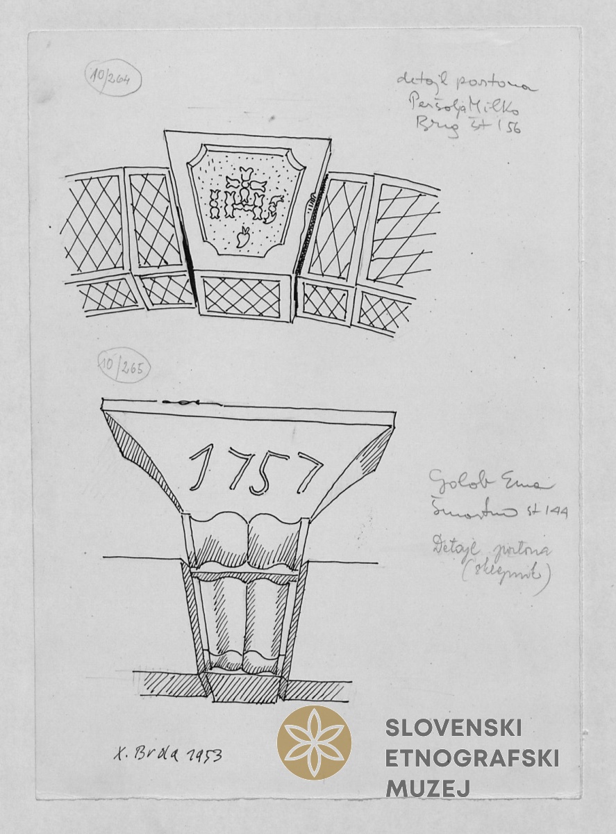 Zali Breg pri Šmartnem 31.8.1953 R0000010/264 Detajl portona - sklepnik. Lastnik Peršolja Milko, Breg - Šmartno 156. Vrata, portal