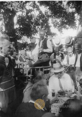 Nikojevići pri Čajetini ob priliki pri odpiranja nove ceste. Pevec Bojo Bojović, kmetovalec, sedeč na vozu, poje družbi pesem.