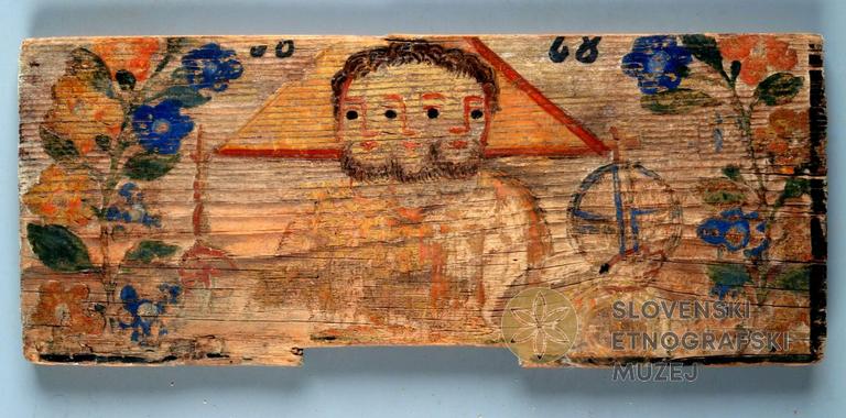 Upodobitev figure z glavo, v kateri so združene tri glave; ikonografska predstava, ki je bila s papeškim dekretom leta 1628 strogo prepovedana vendar se je v nabožni preprosti, podeželski, necerkveni umetnosti obdržala vse do konca 19. stoletja. Končnica je bila najdena na Lokovici nad Libučami.