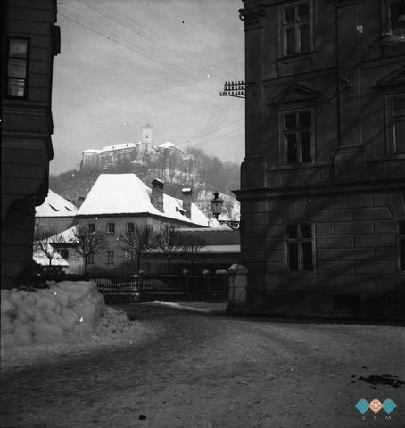 Pogled na Ljubljanski grad z vogala Trga francoske revolucije.