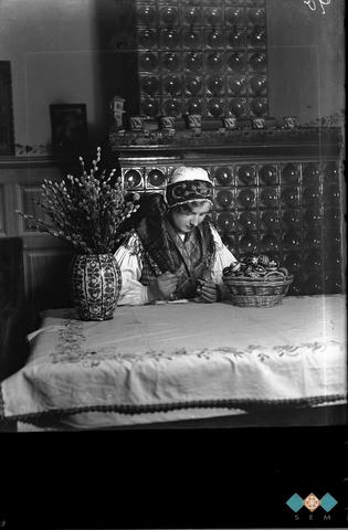 Ženska v t.i. "narodni" noši izdeluje pirhe.