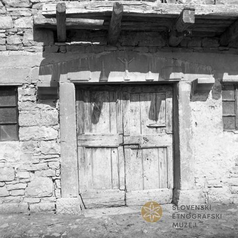 "Kalonja" (vhod v štalo- hlev), Pregarje 77, pri Frankovih. Napis na levi: Janez Burmc 38, na desni: Anton Frank, 1874.