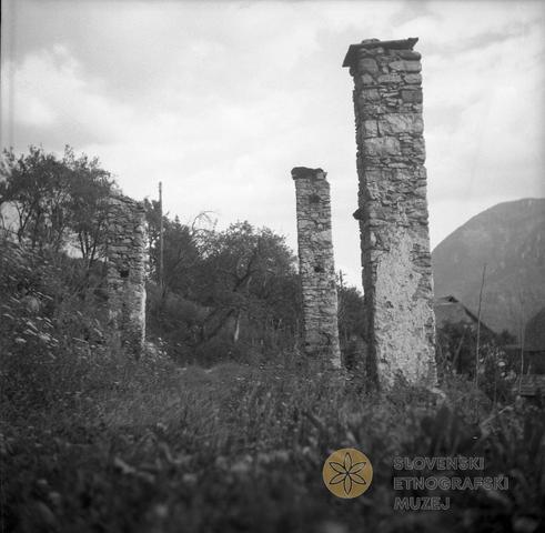 Kamniti stebri, ostanki požganega kozolca v Otaležu.