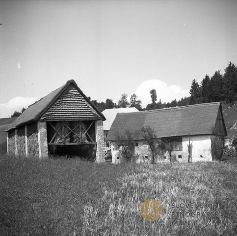 "Kozuc" (dvojni kozolec) in "štala" (hlev) (zadaj hiša) na poti med Šentviško Goro in Jerovco.